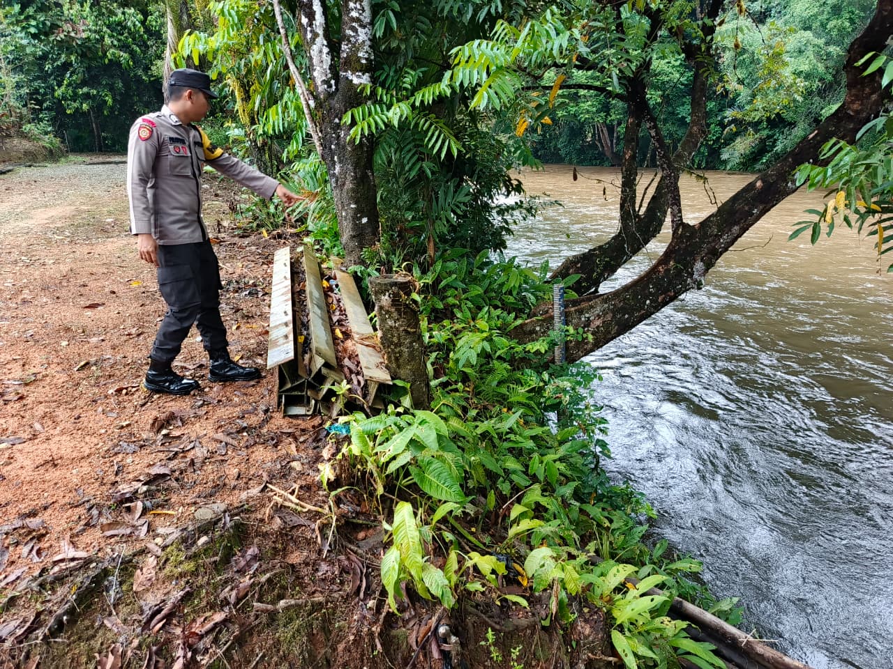 Polres Lamandau – Polsek Delang, Piket Polsek Delang melakukan kegiatan rutin pengecekan debit air DAS Delang di TMA Kelurahan Kudangan RT.02 Kecamatan Delang, Selasa (16/9/25) pagi