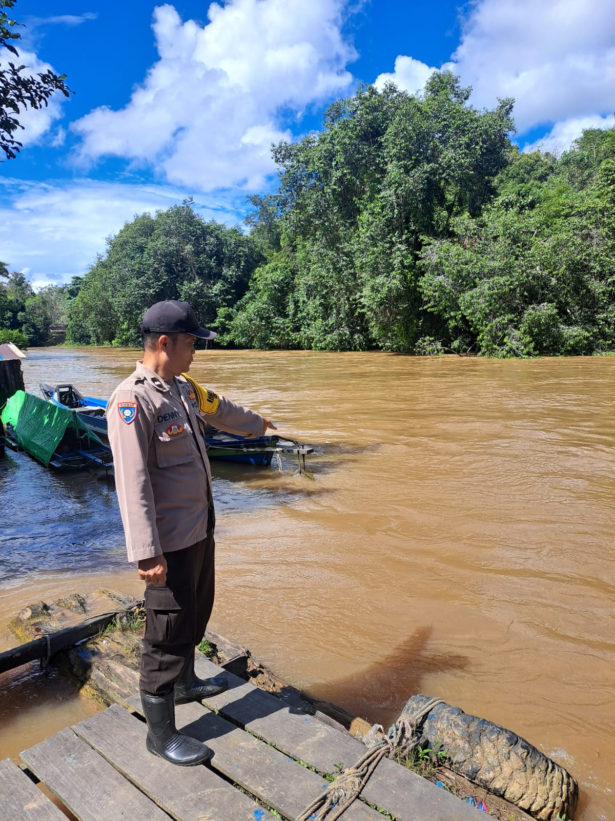 Polres Katingan- Mendeteksi potensi bencana banjir, Bhabinkamtibmas Desa Tumbang Kajamei Polsek Katingan Hulu dan Bukit Raya, Polres Katingan, Polda Kalteng Aipda Denny Ariadi melakukan pemantauan debit air di Daerah Aliran Sungai (Das) Katingan wilayah Kecamatan Kec.Bukit Raya, Selasa (17/9/2025) pagi.