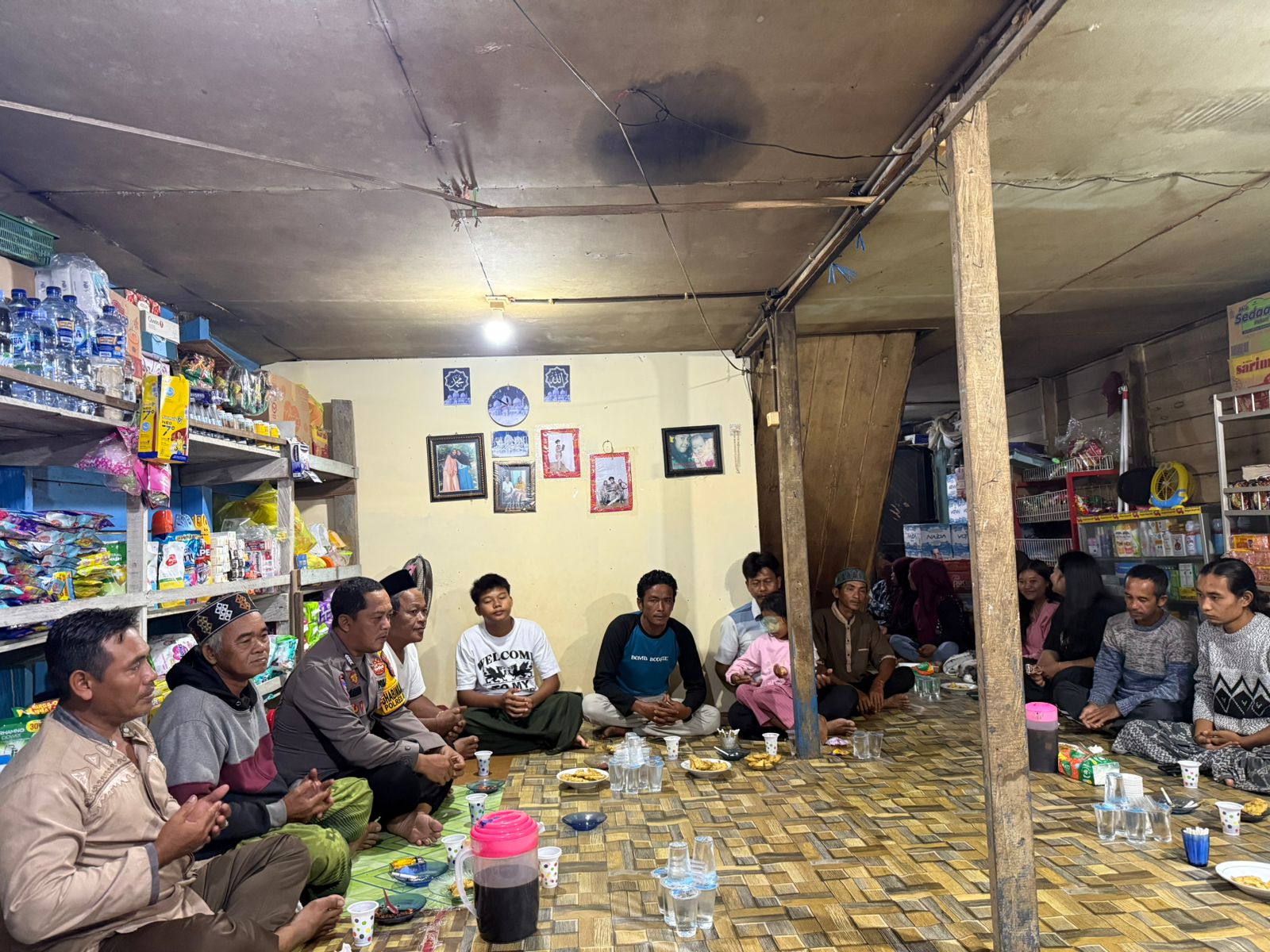 Kegiatan ini sekaligus menjadi ajang silaturahmi dalam rangka menghadiri acara syukuran di Kediaman Rumah Bapak H. MIDUN Pada kesempatan tersebut, Bhabinkamtibmas tak hanya menjalin keakraban dengan warga, namun juga memanfaatkan momen untuk menyampaikan pesan-pesan kamtibmas. Ia mengingatkan pentingnya kewaspadaan terhadap pelaku tindak pidana, serta meningkatkan pengawasan lingkungan dari potensi peredaran narkoba dan kenakalan remaja seperti tawuran.