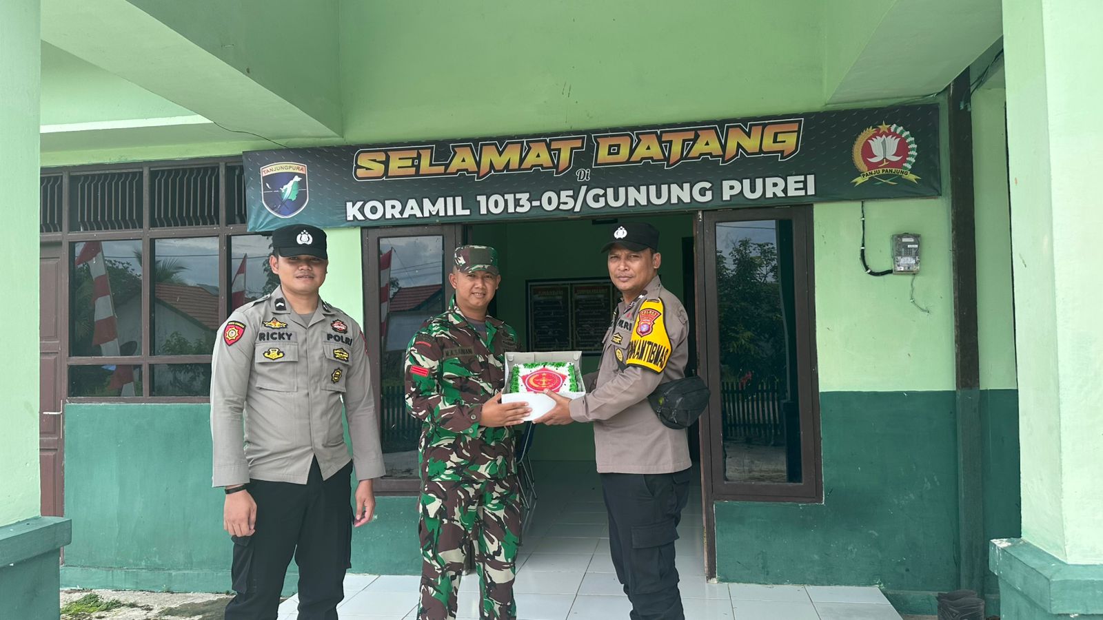 Barito Utara – Dalam rangka memperingati Hari Ulang Tahun (HUT) Tentara Nasional Indonesia (TNI) ke-80 yang jatuh pada hari ini, Kapolsek Gunung Purei Ipda Suryadinatal, S.H. bersama personel Polsek Gunung Purei memberikan kejutan istimewa kepada Danramil 1013-05/Gunung Purei beserta jajaran di Makoramil setempat, Sabtu (5/10/2025).
