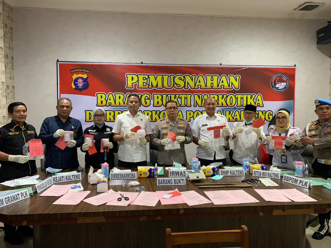 Pemusnahan Narkoba dipimpin oleh Irwasda Polda Kalteng, Kombes Pol. Dr. Benny Ganda Sudjana, didampingi oleh Direktur Resnarkoba Polda Kalteng, Kombes Pol. Dodo Hendro Kusuma. Turut hadir dalam kegiatan tersebut para pejabat dan stake holder terkait antara lain Kepala BNNP Kalteng yang diwakili oleh Kepala BNN Kota Palangka Raya, Kombes Pol. I Wayan Korna, Kepala Kejaksaan Tinggi Kalteng diwakili Kasi Narkotika Ibu Yuliati, Ketua Pengadilan Negeri Palangka Raya yang diwakili Panitera Muda Khusus Tipikor Bapak Efraim, Kepala Balai Besar Pengawas Obat dan Makanan (BBPOM) Palangka Raya diwakili Ibu Wahyu Puspita Dewi, Ketua MUI Kalteng diwakili Ketua Gerakan Nasional Anti Narkoba (GANAS ANNAR) Bapak Bajasukma, Sekretaris LSM Gerakan Anti Narkoba (GRANAT) Bapak Aston Pakpahan, serta dihadiri juga oleh Para Penyidik dan Para Tersangka kasus terkait.