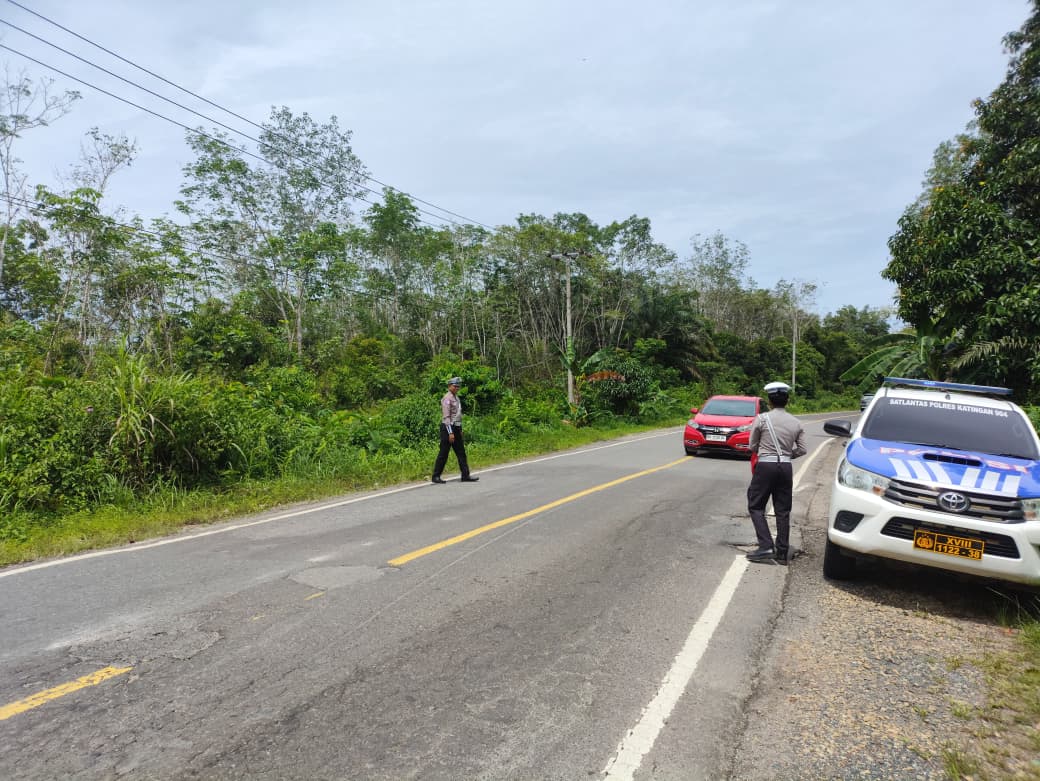 Nampak dalam kegiatan tersebut Personil Piket Satlantas Polres Katingan memberikan intruksi kepada pengguna jalan saat melewati jalan tersebut agar berhati hati dan memelankan laju kendaraannya dikarenakan daerah tersebut terdapat pemukiman warga dan tikungan tajam setelahnya.