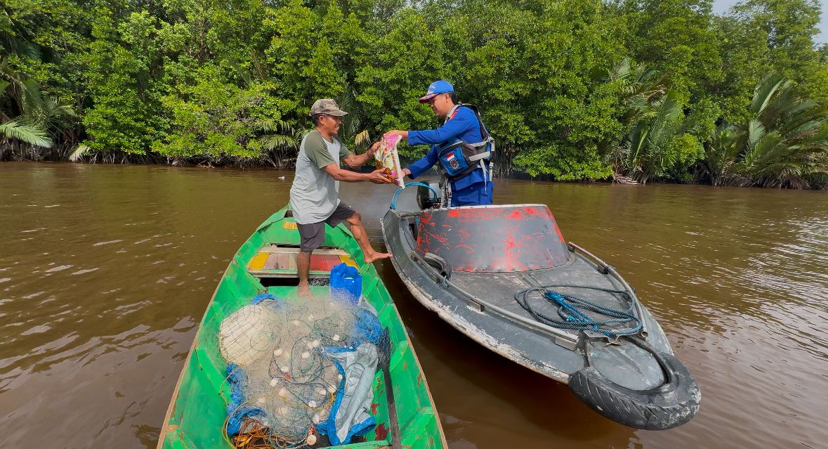 Kumai – Personel Ditpolairud Polda Kalimantan Tengah yang bertugas di Kapal Patroli XVIII-2004 yang berada di Das Kumai membagikan Bansos Kepada Masyarakat yang tinggal di Desa Kumai Hulu Kecamatan Kumai Kabupaten Kobar, Kamis Tanggal (8/01/2026).