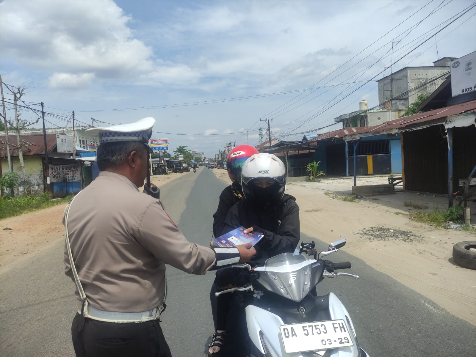 Personil Satlantas Polres Katingan sebagai anggota preemtif bergerak turun ke Jalan untuk meninformasikan kepada pengendara melalui pembagian brosur, untuk menciptakan keamanan dan keselamatan berlalu lintas.