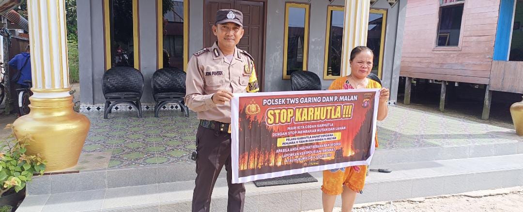 Polres Katingan- Melalui media spanduk, Bhabinkamtibmas Polsek Tewang Sangalang Garing dan Pulau Malan, Polres Katingan, Polda Kalteng, Bripka Jon Praisen, menyampaikan imbauan pencegahan kebakaran hutan dan lahan (karhutla) kepada warga Kecamatan Tewang Sangalang Garing, Jumat (06/02/2026) pagi.