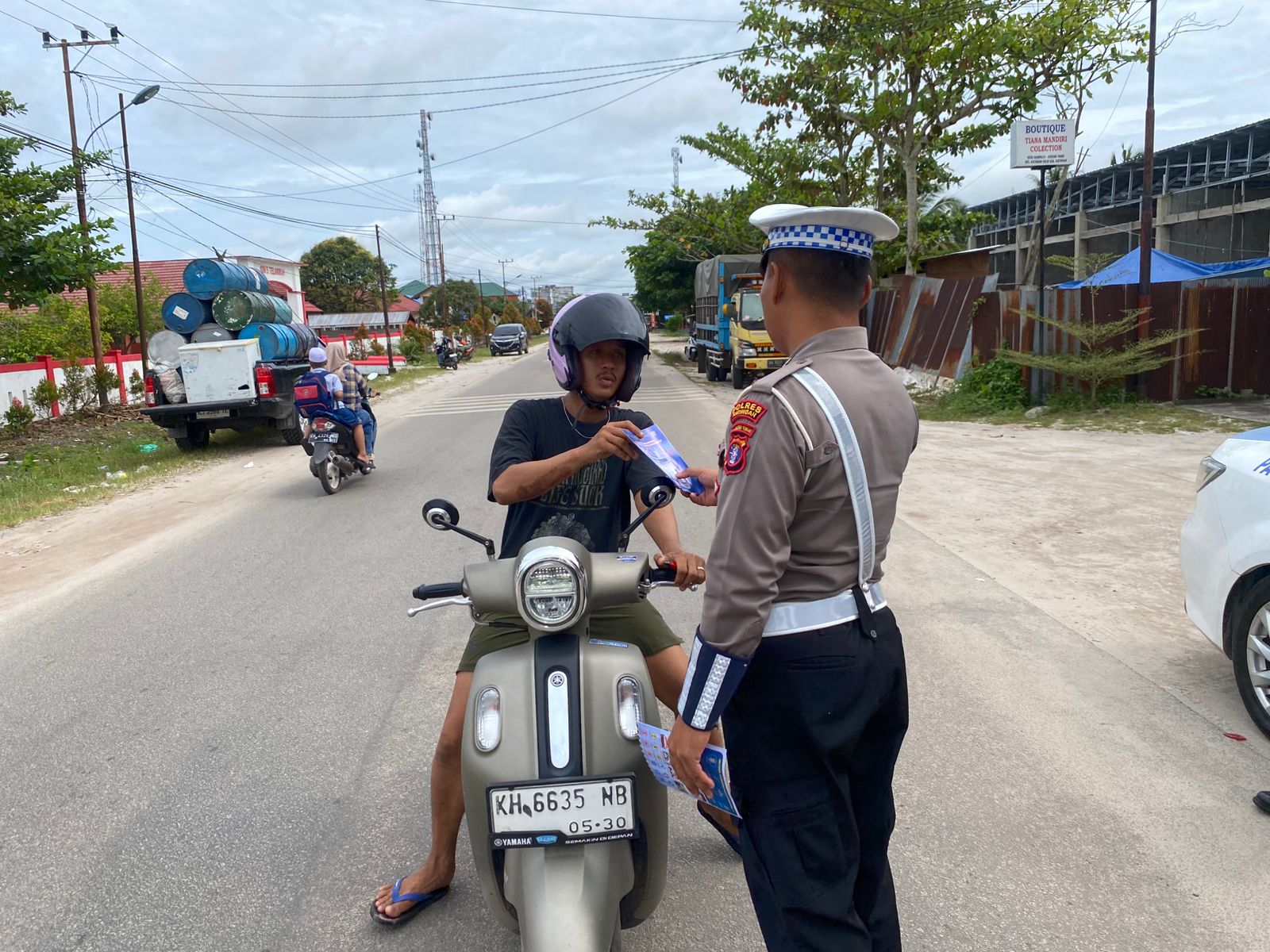 Personil Satlantas Polres Katingan sebagai anggota preemtif bergerak turun ke Jalan untuk meninformasikan kepada pengendara melalui pembagian brosur, untuk menciptakan keamanan dan keselamatan berlalu lintas.