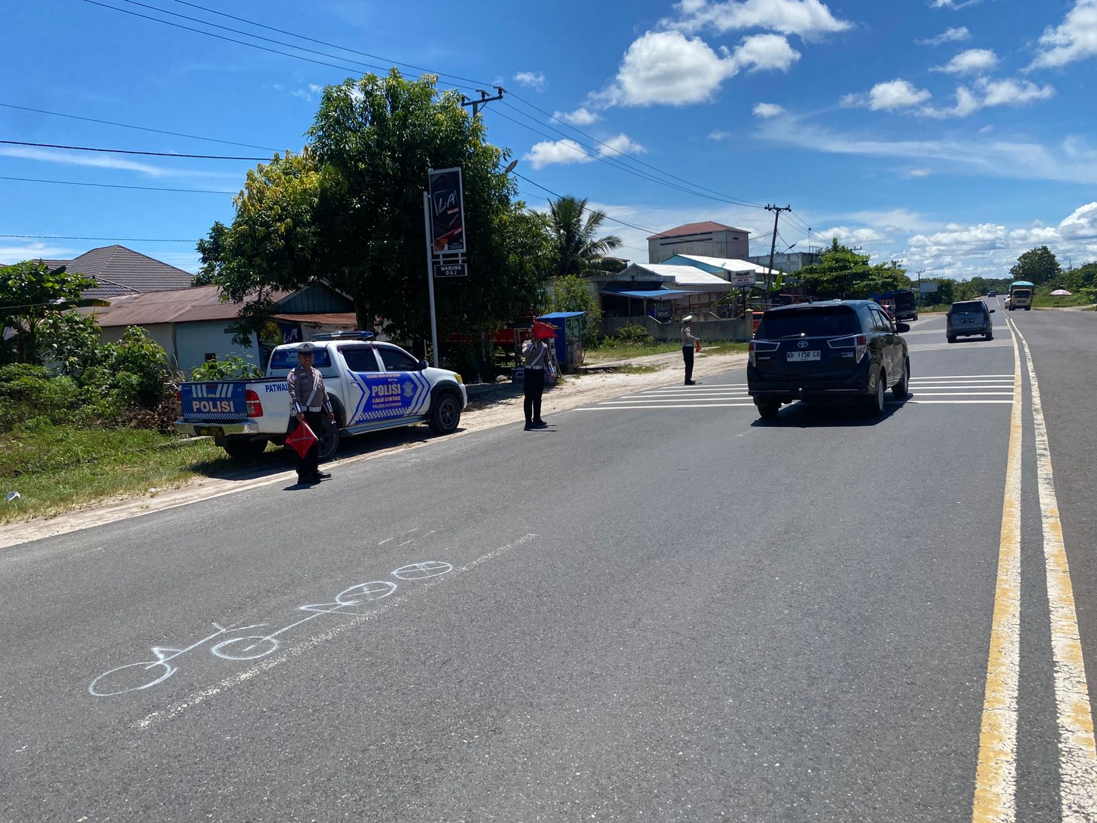 Nampak dalam kegiatan tersebut Personil Piket Satlantas Polres Katingan memberikan intruksi kepada pengguna jalan saat melewati jalan tersebut agar berhati hati dan memelankan laju kendaraannya dikarenakan daerah tersebut terdapat pemukiman warga dan tikungan tajam setelahnya.