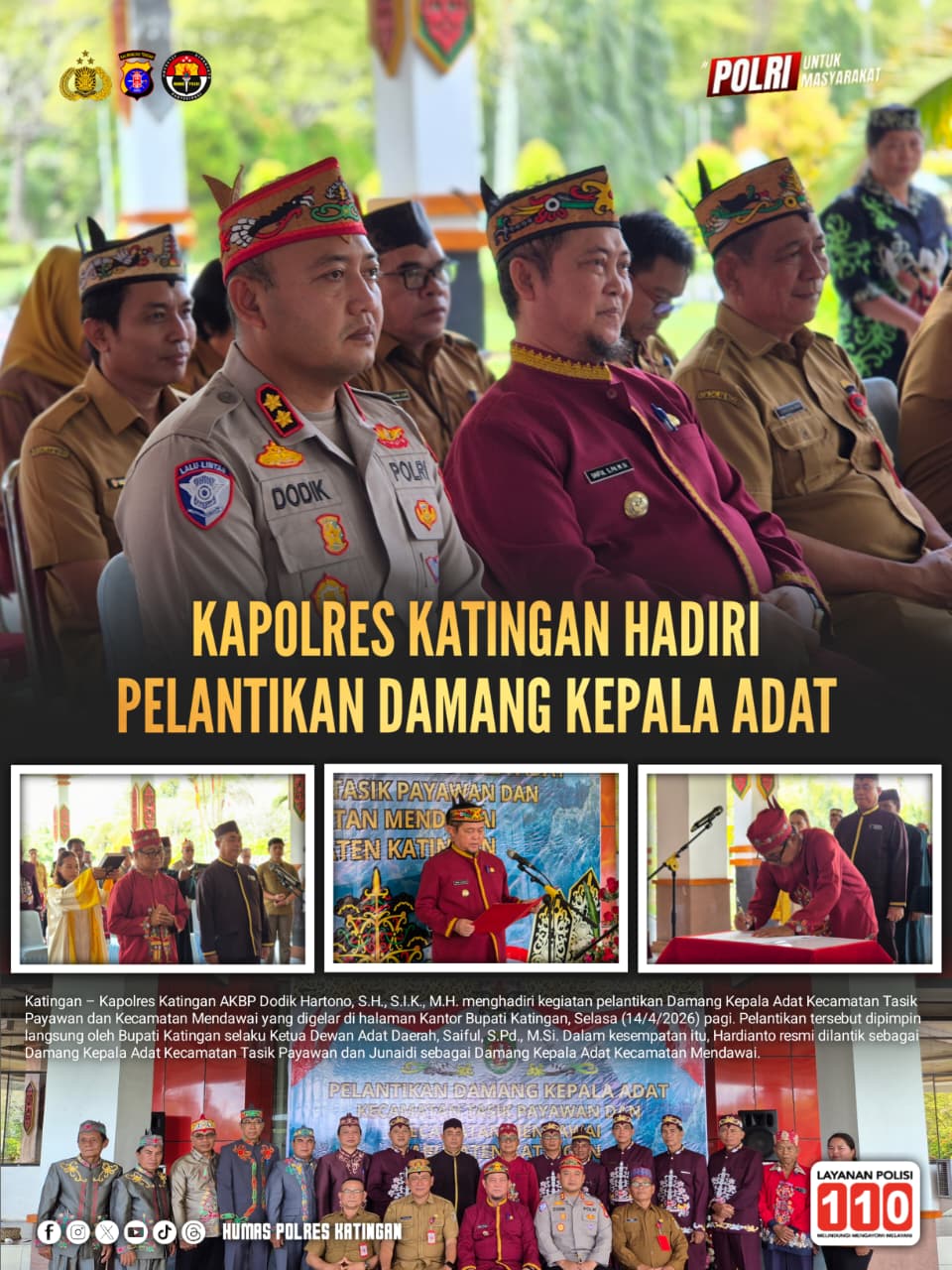Katingan – Kapolres Katingan AKBP Dodik Hartono, S.H., S.I.K., M.H. menghadiri kegiatan pelantikan Damang Kepala Adat Kecamatan Tasik Payawan dan Kecamatan Mendawai yang digelar di halaman Kantor Bupati Katingan, Selasa (14/4/2026) pagi.